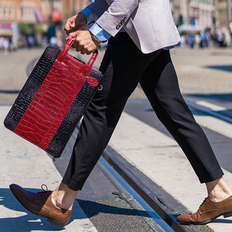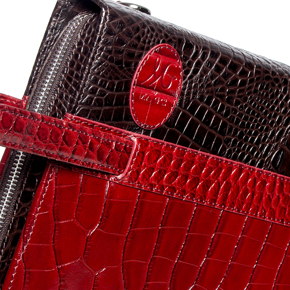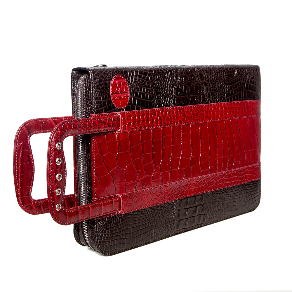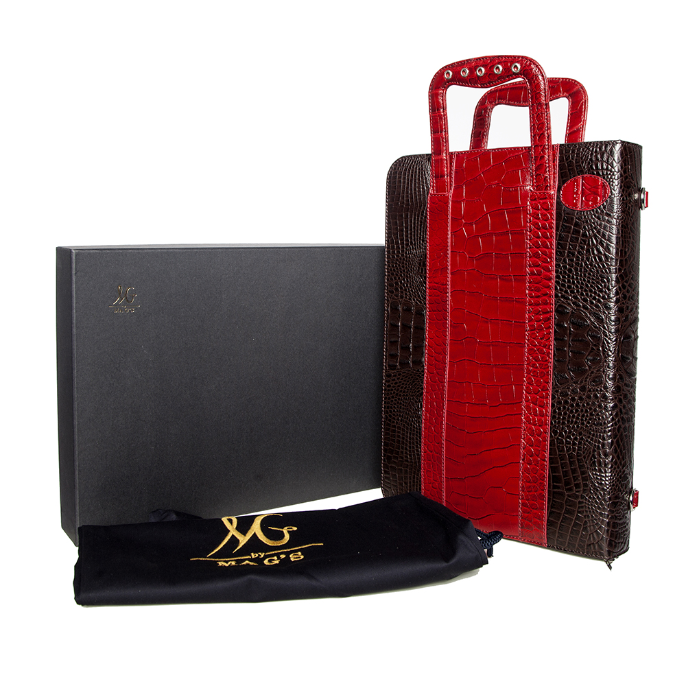 The Gance Laptop Case Ury, Red & Black colour include removable/adjustable nylon strap (110cm) long with snaphooks on both sides. Removable handles in & out for easy grip with detail eyeleds in the handles and hooks for strap attachment. Inside of the Laptop Case suede fabric in the same colour as the frame outside Laptop Case colour. The Laptop Case folds completely open. There you will see leather lining combined with a strong elastic to keep your Laptop safe in place. On the other side you will see a strong elastic band to store your adapter and also you will see the details of the logo MG by MA G’S with leather Croco emborsing. Luggage tag included and inside the luggage tag you will find the certification number of MG by MA G’S.